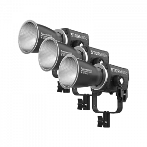 The Aputure STORM 80c 3-Light Kit is an all-in-one professional lighting toolkit—three STORM 80c lamps featuring the BLAIR-CG light engine, Hyper Reflectors, CF4 Fresnels with Barn Doors, Mini Lantern Diffusers, the Light Dome 40 Diffuser, Bowens Adapter, Handheld Bracket, battery cables, and mounting clamps, all in a hard-shell rolling case.