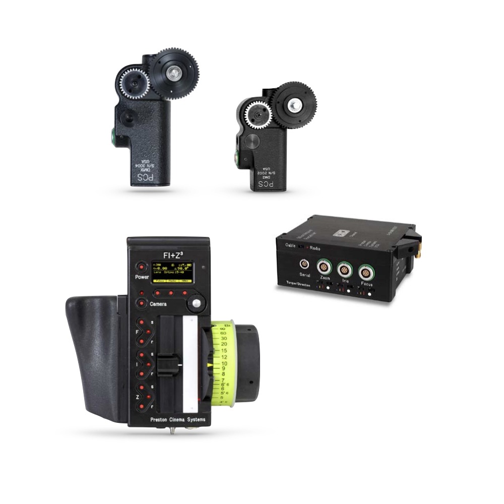 The Preston FI+Z system consists of the HU3 hand unit, a set of Digital Motors, a Micro Force zoom control, and optional controls including wireless Focus/Iris, and Zoom for splitting of functions from the main HU3 hand unit.