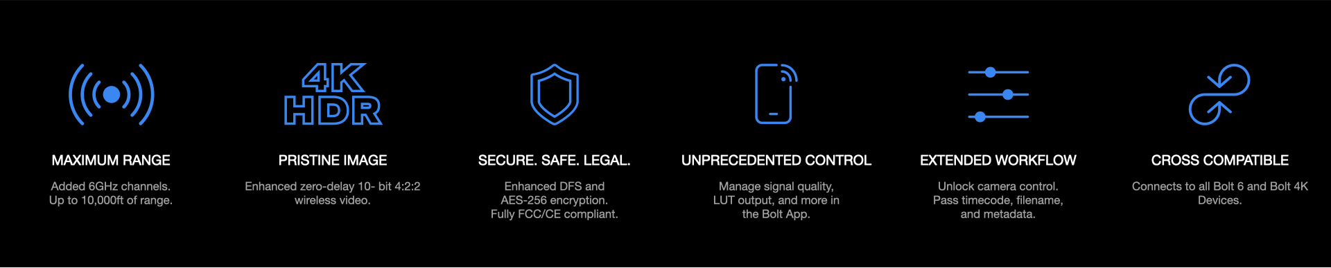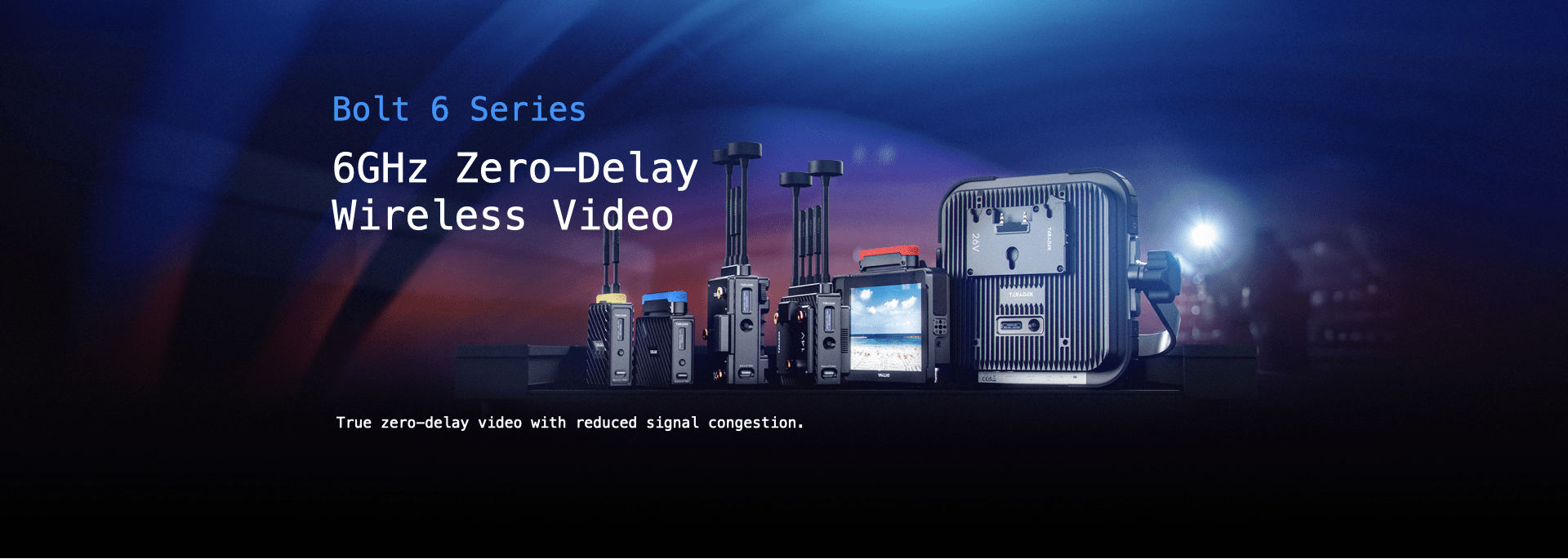 Bolt 6 uses Teradek’s patented Zero-Delay silicon chip to send wireless video over 5GHz and 6GHz radio frequencies with line of sight transmission up to 1500 feet.